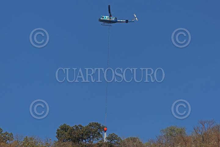 El Helicóptero Tlaloc, durante los trabajos para sofocar el incendio en el Cerro del Colli, parte del Bosque de la Primavera.
