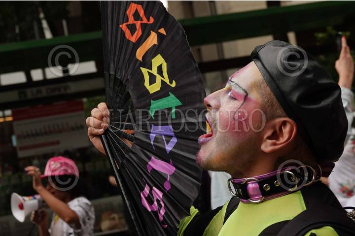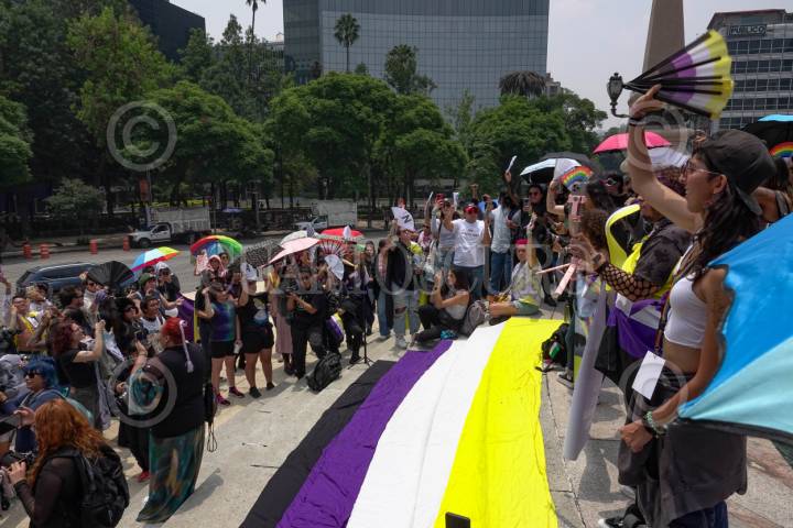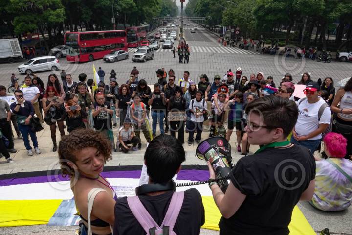 CIUDAD DE MÉXICO 12JULIO2025.- Integrantes de la comunidad No Binaria, durante el mitin desde el Ángel de la Independencia. FOTO: ROGELIO MORALES /CUARTOSCURO.COM