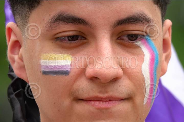 CIUDAD DE MÉXICO 12JULIO2025.- Participante de la Marcha No Binarie, con maquillaje alusivo a la comunidad LGBTTIQ+, la cual partió del Ángel de la Independencia y culminó en el Bosque de Chapultepec. FOTO: ROGELIO MORALES /CUARTOSCURO.COM