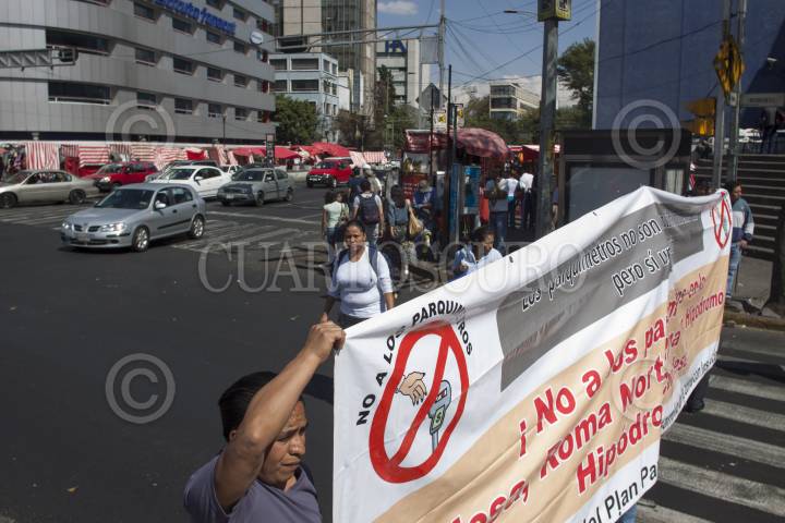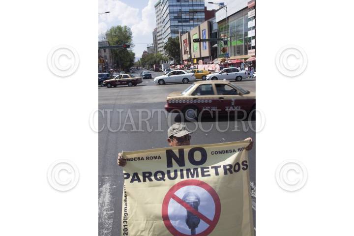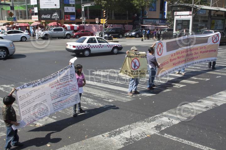 MÉXICO, D.F., 09FEBRERO2013.- Vecinos de las colonias Roma y Condesa realizaron una protesta para exigir que se respete la consulta para la instalación de parquímetros en las mencionadas colonias, ya que según sus datos el "no" fue del 53.87%, sin embargo, autoridades delegacionales pretenden colocarlos en ciertas zonas de la Roma-Condesa, y con esto faltarle al respeto al resultado de la consulta ciudadana. Los manifestantes comenzaron una campaña de informativa en el cruce de las avenidas Insurgentes y Baja California. FOTO: MOISÉS PABLO /CUARTOSCURO.COM