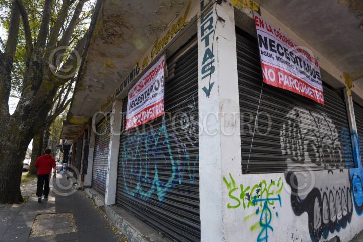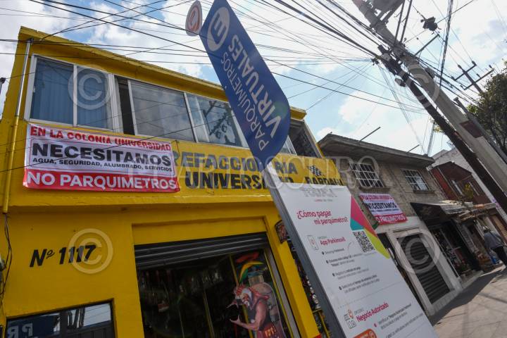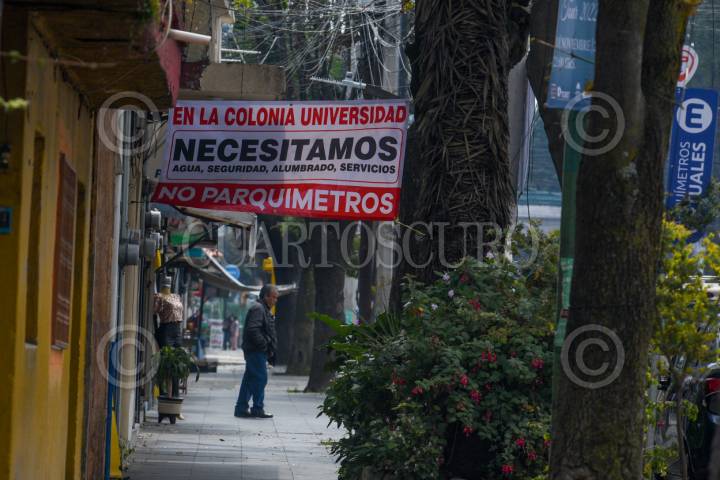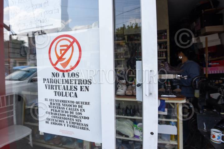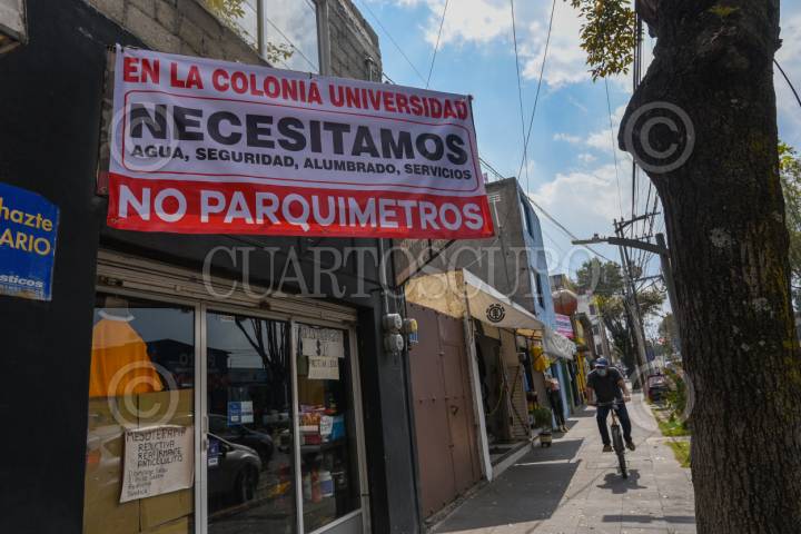 Vecinos y comercios de la colonia Universidad en Toluca colocaron mantas en donde expresan su rechazo a los parquímetros virtuales que instaló el gobierno municipal, piden se atiendan sus necesidades de servicios como agua, seguridad y alumbrado.