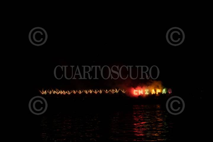 A orillas del Río Grijalva se reunieron personas para disfrutar del espectáculo pirotécnico que representa las batallas que se lidiaron en la región entre la comunidad chiapaneca y españoles en la época de la colonización.