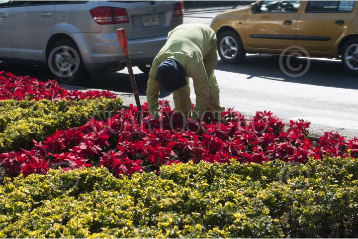 MÉXICO, D.F., 19DICIEMBRE2012.- Un trabajador del Gobierno del Distrito Federal, coloca nochebuenas sobre avenida Paseo de la Reforma, a la altura del bosque de Chapultepec. FOTO: DIEGO SIMÓN SÁNCHEZ /CUARTOSCURO.COM