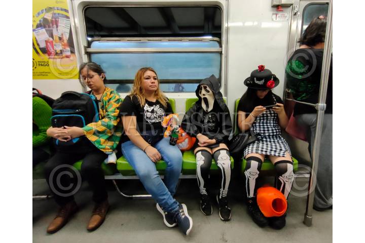 CIUDAD DE MÉXICO, 01NOVIEMBRE2023.- En el marco de la celebración de Día de Muertos y Halloween, un par de niñas disfrazadas transitan en el metro. FOTO: GRACIELA LÓPEZ /CUARTOSCURO.COM