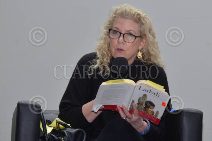 La escritora Jennifer Clement, durante su participación en la lectura pública de fragmentos del libro "Ladydi" en la Librería Rosario Castellanos, como parte de la jornada 16 días de activismo contra la violencia de género.