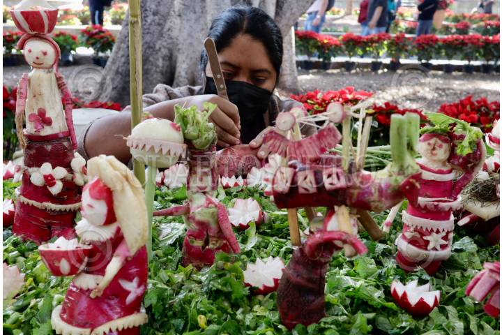 50 hortelanos participaron en tradicional Noche de Rábanos en la explanada del estado de Oaxaca. La celebración había sido suspendida debido a la pandemia por Covid-19.