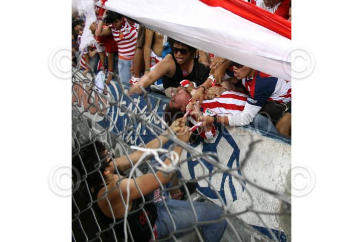 GUADALAJARA, JALISCO17 MAYO 2008.- Los rayados del Monterrey consiguieron su pase a la semifinal al empatar a 4 goles con las chivas de Guadalajara en el estadio Jalisco esta noche en la imagen aficionados pelean la playera que Omar Bravo lanzo a la aficion al termino del encuentro FOTO: SASHENKA GUTIERREZ/CUARTOSCURO.COM