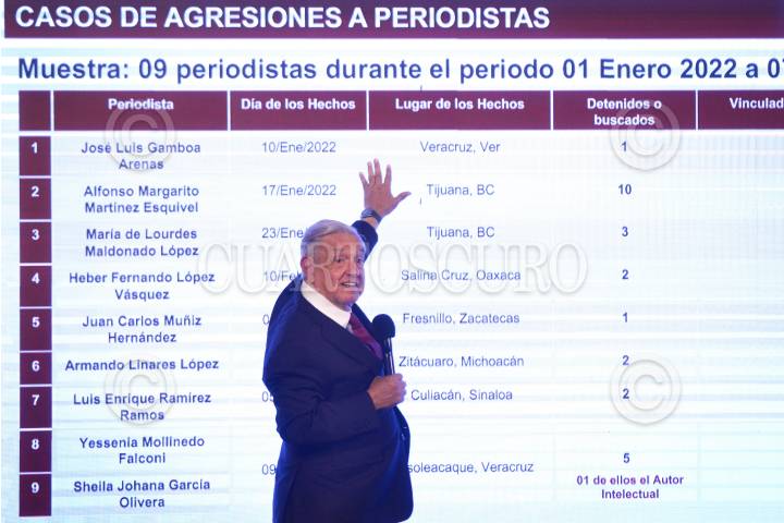 Andrés Manuel López Obrador, presidente de México, mostró el número de periodistas violentados en lo que va del año, durante conferencia matutina realizada en Palacio Nacional.