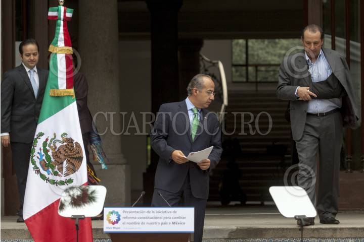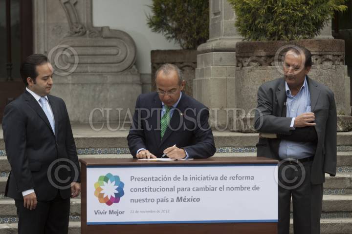 MÉXICO, D.F., 22NOVIEMBRE2012.- Alejandro Poiré, secretario de Gobernación, Felipe Calderón Hinojosa, Presidente de México, y Miguel Alessio Robles, consejero jurídico de la Presidencia, durante presentación de la iniciativa de Reforma Constitucional para cambiar el nombre de nuestro país a "México", que se realizó en la escalinata de la residencia "Miguel Alemán", de la residencia oficial de Los Pinos. FOTO: MOISÉS PABLO /CUARTOSCURO.COM