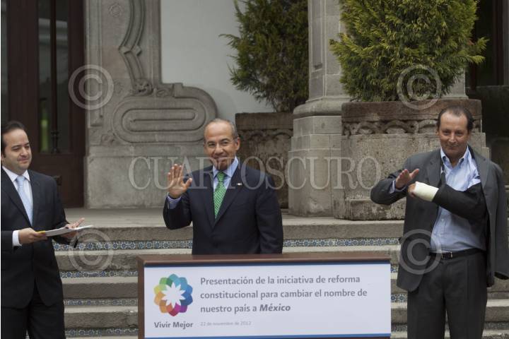 MÉXICO, D.F., 22NOVIEMBRE2012.- Felipe Calderón Hinojosa, Presidente de México, presentó de la iniciativa de Reforma Constitucional para cambiar el nombre de nuestro país a "México", que se realizó en la escalinata de la residencia "Miguel Alemán", de la residencia oficial de Los Pinos. FOTO: MOISÉS PABLO /CUARTOSCURO.COM