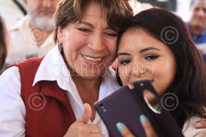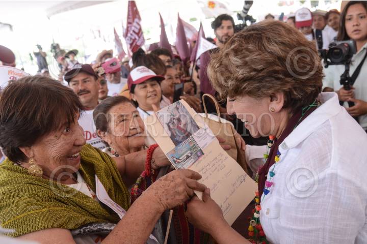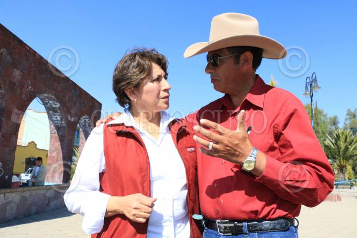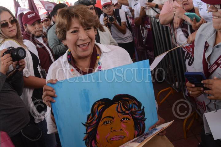 Delfina Gómez, candidata a la gubernatura del Estado de México, por la coalición Morena, PT y PVEM, durante su gira de campaña en la explanada de la entidad.