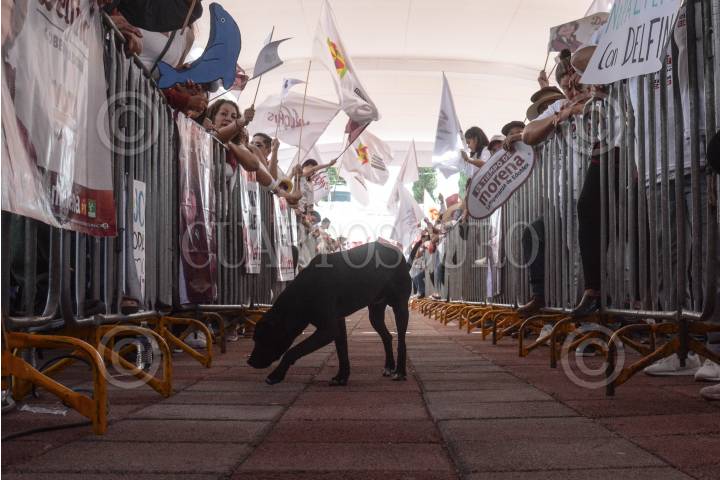 Un canino camina sobre el pasillo donde Delfina Gómez, candidata a la gubernatura del Estado de México, por la coalición Morena, PT y PVEM, realizó su de campaña en la explanada de la entidad.