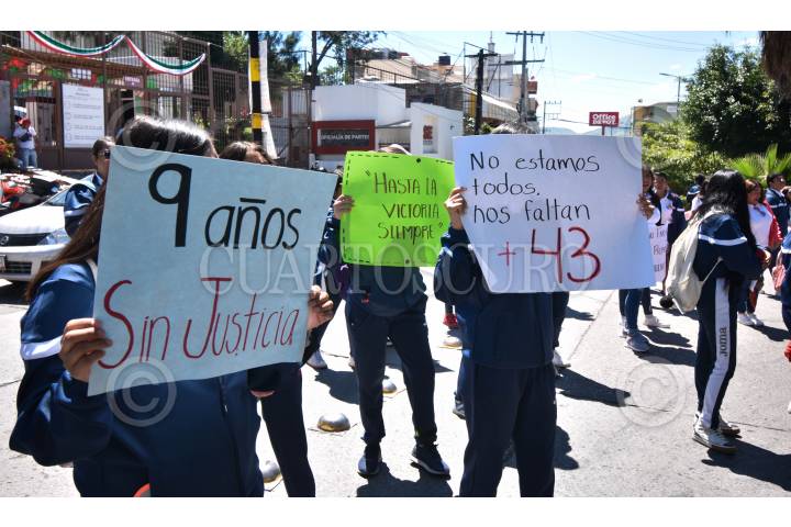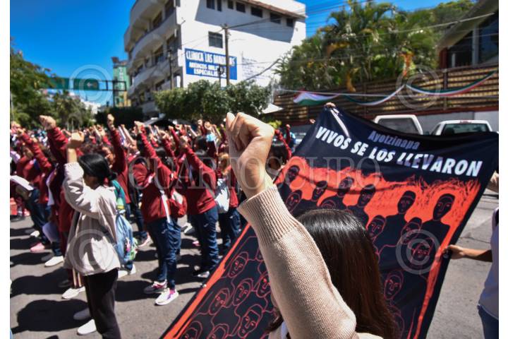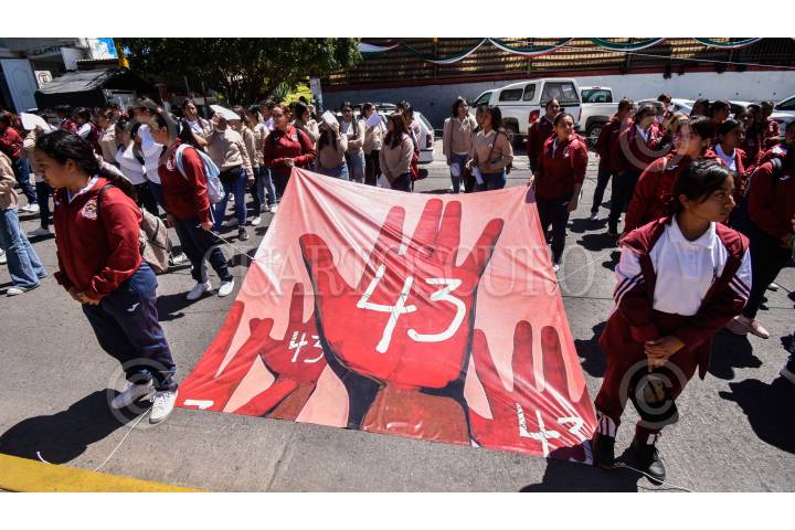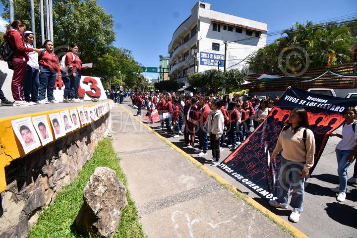CHILPANCINGO, GUERRERO. 26SEPTIEMBRE2023.- Estudiantes de tres normales urbanas públicas de la capital del estado de Guerrero, realizaron un mitin en el antimunomento a los 43, lugar en el que reclamaron la presentación con vida de los 43 desaparecidos de la Normal Rural de Ayotzinapa hace nueve años en los ataques registrados en Iguala de la Independencia. Ellos realizaron un mitin en el marco delos nueve años de la desaparición de sus 43 compañeros de la Normal Rural de Ayotzinapa. El mitin inicio desde las 11:00, horas cuando el grupo aproximado de 500 estudiantes arribaron en marcha hasta el Antimonumento de los 43, sin que se generara ningún disturbio, aunque sí cerraron la circulación de los vehículos. FOTO: DASSAEV TÉLLEZ/CUARTOSCURO.COM