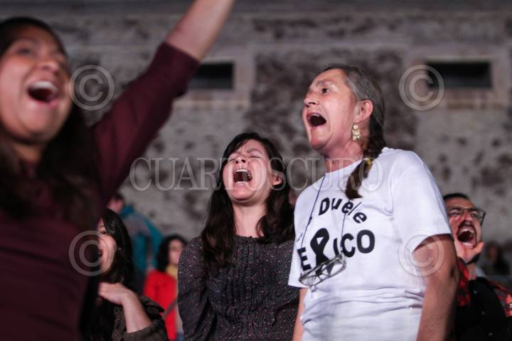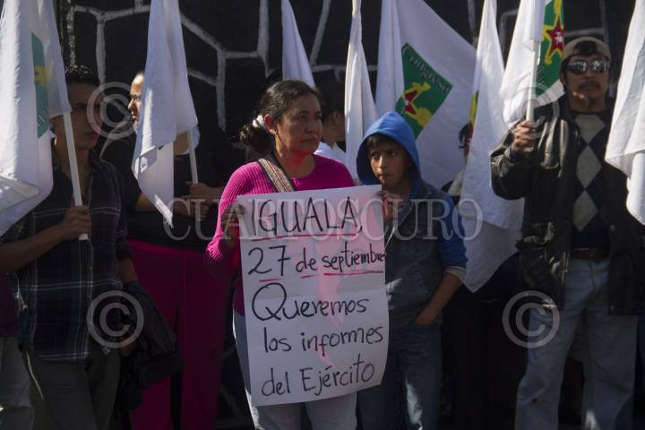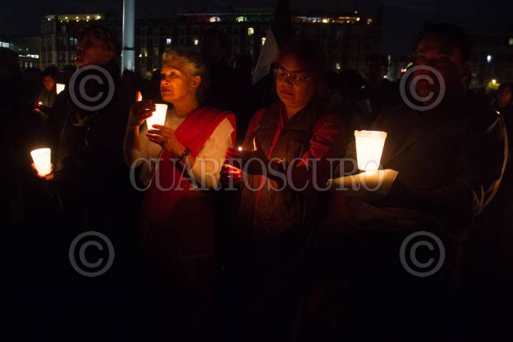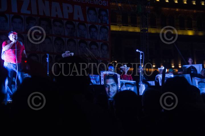 MÉXICO, 26ENERO2015.- Tras ocho horas de marchar desde los cuatros puntos cardinales de la ciudad de México, por la octava accion global por Ayotzinapa, miles de mexicanos se reunieron en el Zócalo capitalino, para escuchar lo que los padres de familia exigen al gobierno federal y estatal, que es la presentación con vida de los 43 estudiantes normalistas desaparecidos hace cuatro meses. FOTO: ISABEL MATEOS /CUARTOSCURO.COM