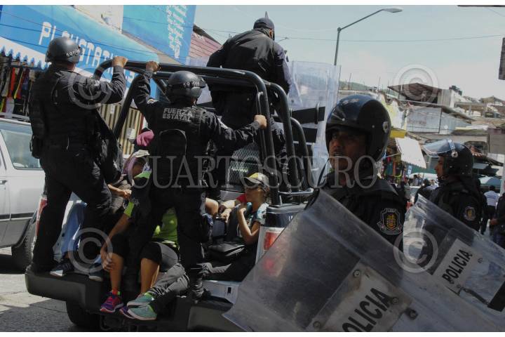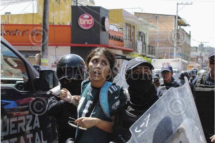CHILPANCINGO, GUERERRO, 27AGOSTO2015.- Policías estatales detienen a 6 normalistas del Frente Único de Normales Publicas del Estado de Guerrero (FUNPEG) en la avenida Miguel Alemán en el centro de la ciudad, la detención se dio luego de que los manifestantes que exigen plazas automáticas retuvieron dos camiones distribuidores, posteriormente tomaron la avenida Lázaro Cárdenas, continuaron por la avenida Juan Álvarez, dieron vuelta para tomar la avenida Miguel Alemán, donde fueron encapsulados, por los uniformados, en el lugar detuvieron a 6 entre ellos a una mujer, y para persuadir a los demás lanzaron gas lacrimógeno, que también alcanzaron los comerciantes establecidos en la calle. FOTO: JOSÉ I. HERNÁNDEZ /CUARTOSCURO.COM