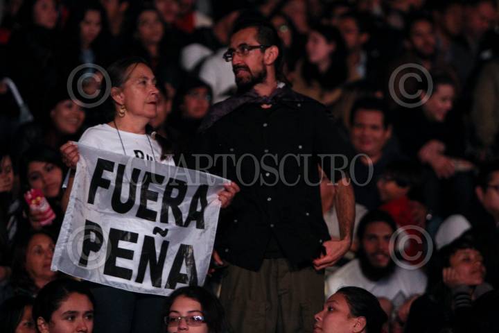 GUANAJUATO, GUANAJUATO, 24OCTUBRE2015.- Los 43 estudiantes normalistas desaparecidos hace más de un año en Iguala Guerrero fueron recordados durante el concierto que ofreció la banda Gitana Taraf de Haidouks, decenas de personas al finalizar el concierto contaron hasta el numero 43 y mostraron mantas con la leyenda de -Peña, Fuera. FOTO: ISABEL MATEOS /CUARTOSCURO.COM