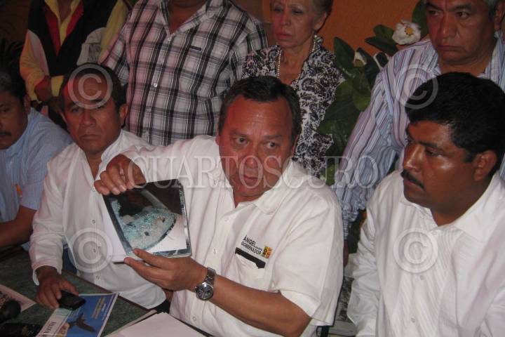 CHILPANCINGO, GUERRERO, 12NERO2011.- Jesús Zambrano, coordinador de la campaña de la coalición "Guerrero nos Une" acompañado por del dirigente estatal del PRD, Misael Medrano Baza y por el dirigente estatal del PT, Fredy García Guevara y de militantes perredistas, condeno la agresión física que sufrió el representante de dicha coalición ante el Instituto Electoral del Estado de Guerrero (IEEG) Guillermo Sánchez Nava, que se suscito la noche del martes, al acudir cerca del Palacio de Gobierno después de recibir una llamada anónima, en la que le hacían saber que algunas personas estaban retirando propagada del candidato a gobernador Ángel Aguirre Rivero, donde sufrió la agresión que lo mantiene sumamente grave debido a un derrame cerebral y fractura de cráneo ocasionados por los golpes que recibió por personas desconocidas y supuestos simpatizantes del candidato a gobernador por la coalición "Tiempos Mejores para Guerrero" Manuel Añorve Baños. En la imagen muestran fotografías de las condiciones en las que quedo el vehiculo en el que se transportaba el agredido así como cuando era traslado en una ambulancia luego de quedar inconsciente. FOTO: OSCAR ALVARADO/CUARTOSCURO.COM