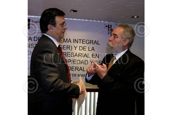 MÉXICO, D.F., 12MARZO2009.- Marcelo Ebrard jefe de gobierno del Distrito Federal y Ingnacio Laborde presidente del consejo de Notarios del D.F., durante la puesta en marcha del sistema integral de gestión registral, que se realizo en el registro publico de la propiedad y de comercio del Distrito Federal. FOTO: RICARDO CASTELAN/CUARTOSCURO.COM