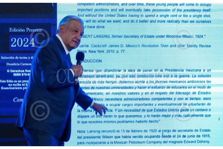 CIUDAD DE MÉXICO, 14FEBRERO2024.- Andrés Manuel López Obrador, presidente de México, muestra la carta redactada en 1924 por Woodro Wilson, entonces secretario de Estado de Estados Unidos, durante la conferencia de prensa matutina desde Palacio Nacional en que se presentó la sección “Quién es quién en las mentiras de la semana”. FOTO: GALO CAÑAS/CUARTOSCURO.COM