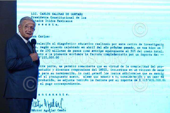 CIUDAD DE MÉXICO, 14FEBRERO2024.- Andrés Manuel López Obrador, presidente de México, muestra una carta redactada por el periodista Héctor Aguilar Camín al entonces presidente Carlos Salinas de Gortari respecto a pagos pro diferentes contratos, durante la conferencia de prensa matutina desde Palacio Nacional. FOTO: GALO CAÑAS/CUARTOSCURO.COM