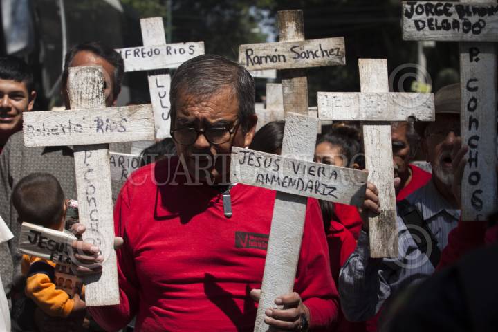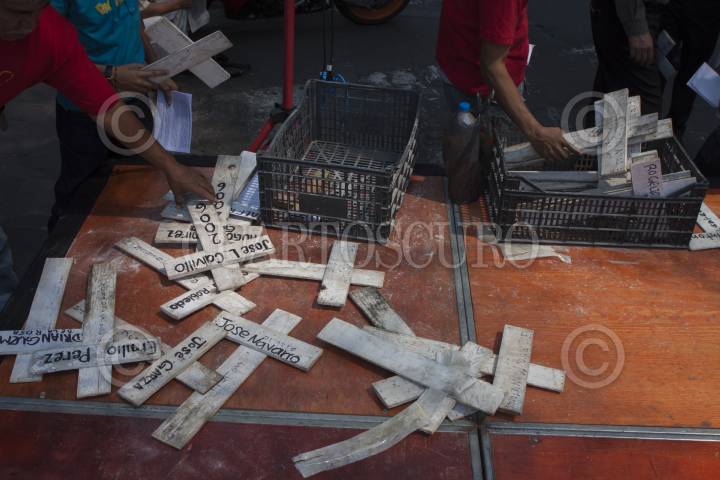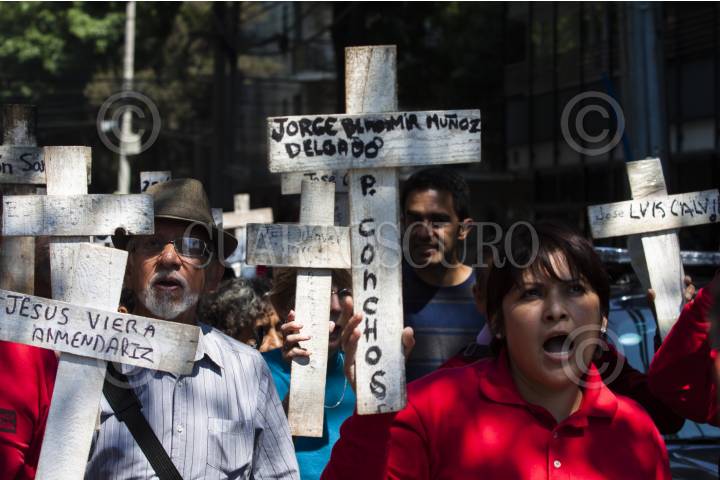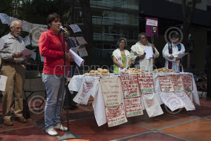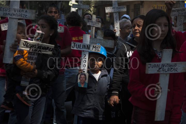 MÉXICO, D.F., 19FEBRERO2015.- A 9 años de la tragedia en Pasta de Conchos, cuyos responsables señalados por la CNDH y la OIT son los funcionarios de la STPS del gobierno de Vicente Fox y la empresa Minera México de Grupo México, familiares de los mineros celebraron una misa para recordarlos y exigir a las autoridades federales el rescate de los cuerpos, esto en la sede de Grupo México en Polanco. Alfonso Navarrete, secretario de Trabajo, ordenó en 2013 un nuevo peritaje que fue detenido por el poder judicial de la federación. La tragedia de Pastas de Conchos ocurrió el 19 de febrero del año 2006, teniendo como saldo de 11 trabajadores heridos y 65 mineros muertos, los restos de 63 aún yacen en el socavón, sin embargo, este no es un hecho aislado en las empresas del empresario Germán Larrea, apenas el año pasado su mina Buenavista del Cobre fue la responsable de un derrame de tóxicos en el Río Sonora. FOTO: MOISÉS PABLO /CUARTOSCURO.COM