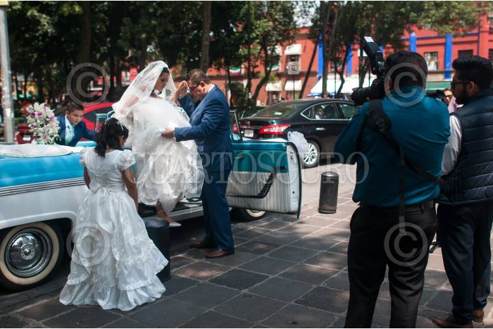 CIUDAD DE MÉXICO, 21SEPTIEMBRE2018.- Una novia baja del automóvil clásico que la trasladó al centro de Coyoacán para su boda. A un lado se encuentra el fotógrafo que registra los hechos. FOTO: DIEGO SIMÓN SÁNCHEZ /CUARTOSCURO.COM