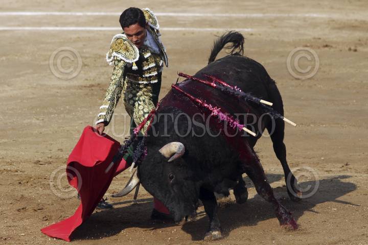 GUADALAJARA, JALISCO, 06OCTUBRE2013.- En la Plaza de Toros Nuevo Progreso se llevó a cabo la séptima novillada, en donde los novilleros del cartel , Cristian Verdín, Juan Pablo LLaguno y Nicolás Gutiérrez, este ultimo quien corto una oreja, lidiaron 6 novillos de Boquilla del Carmen. FOTO: FERNANDO CARRANZA /CUARTOSCURO.COM