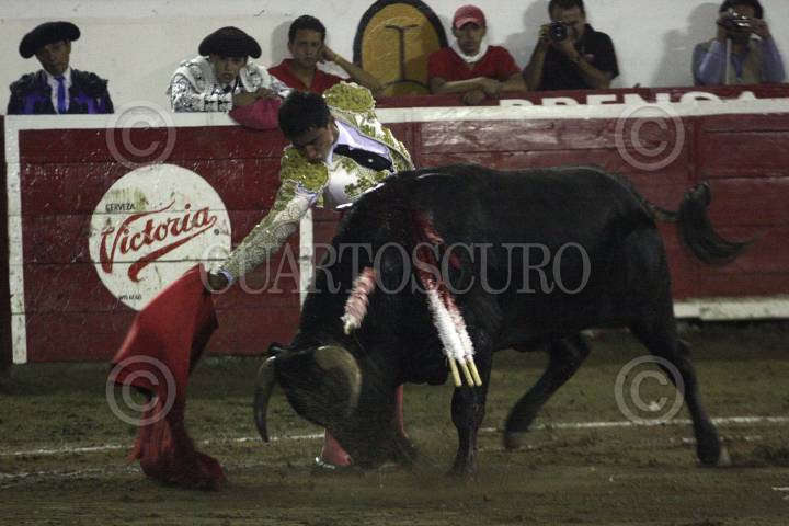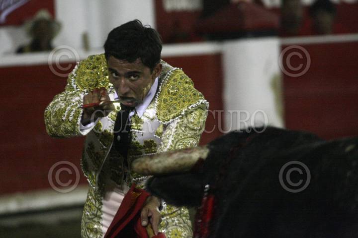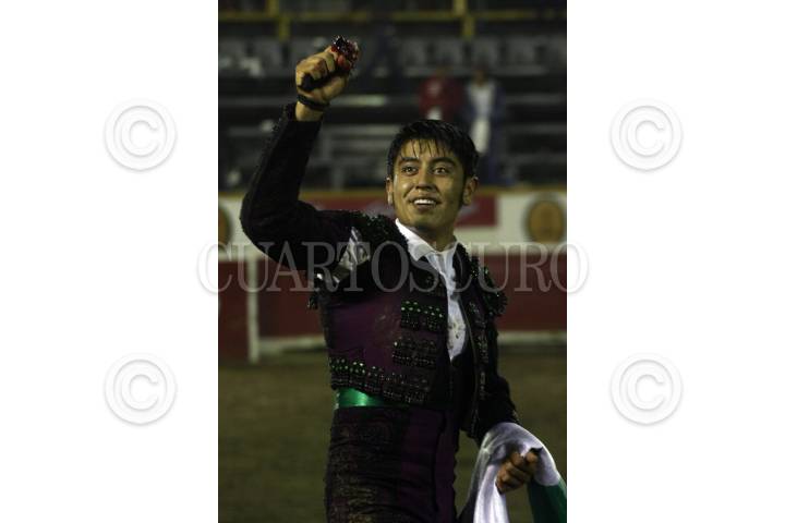 PUEBLA, PUEBLA, 14MAYO2011.- El novillero tlaxcalteca, Oscar Aguilar, cortó un apéndice en la tercera encerrona anoche en la feria en la plaza de toros El Relicario, al matar a Destino, astado de 432 kilogramos de la ganadería El Rocío. FOTO: FRANCISCO GUASCO/CUARTOSCURO.COM