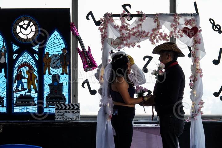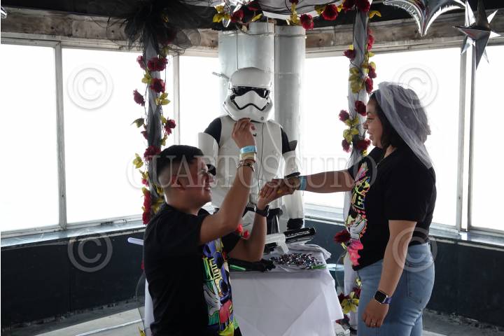 CIUDAD DE MÉXICO, 14FEBRERO2025.- Parejas jóvenes se dieron cita en el piso 35 De la Torre Latinoamericana para participar en las tradicionales “Bodas en las alturas” con la temática de películas. Fue así que un “stormtropper” de la saga de la Guerra de las Galaxias, o bien, el Dr. Brown de Volver al futuro oficiaron las ceremonias. FOTO: GALO CAÑAS/CUARTOSCURO.COM