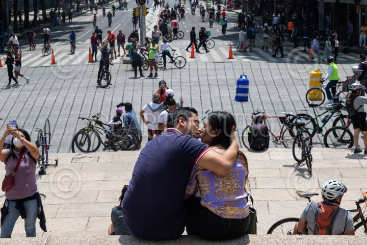 Novios conviven en la escalinatas del Ángel de la Independencia, durante el paseo ciclista.