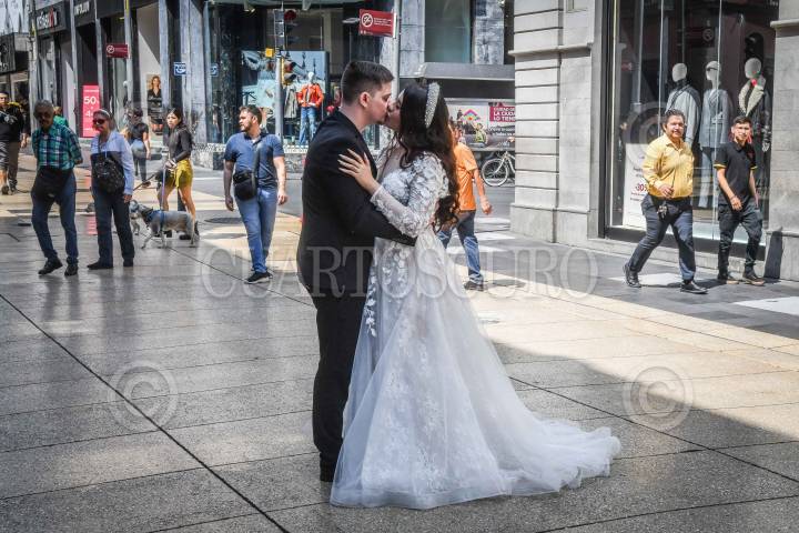 CIUDAD DE MÉXICO, 23OCTUBRE2023.- Una pareja de novios se besan sobre avenida Francisco I. Madero en el Centro Histórico. FOTO: MARIO JASSO/CUARTOSCURO.COM