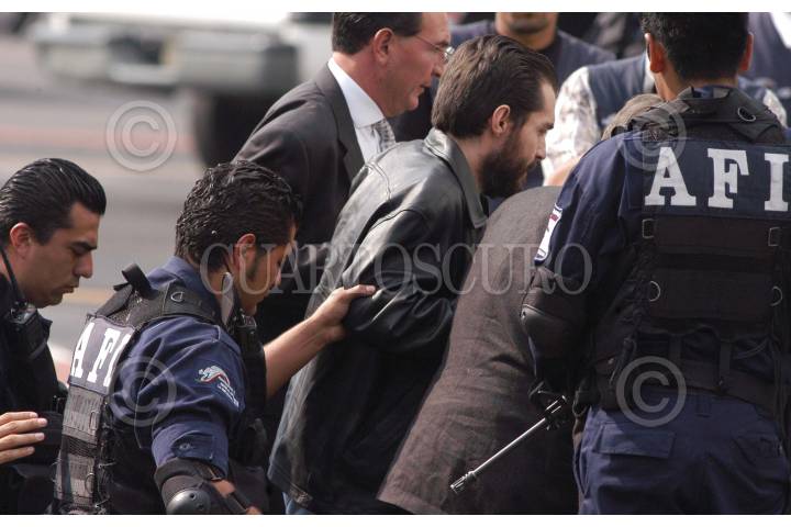 México D.F 28 Abril 2004.- El empresario Carlos Ahumada es escoltado por integrantes de la AFI después de aterrisar al hangar de la PGR en donde es sometido a examenes médicos después de sufrir un infarto. FOTO:Germán Romero/CUARTOSCURO.COM