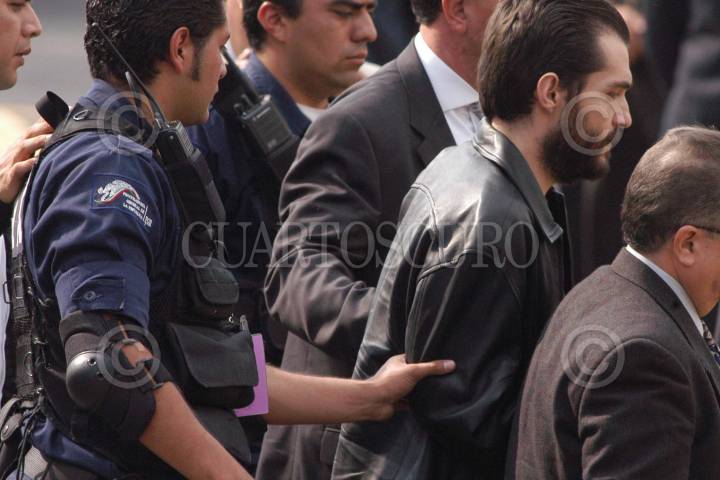 México D.F 28 Abril 2004.- El empresario Carlos Ahumada durante la llegada al hangar de la PGR en donde es escoltado por integrantes de la AFI para ser trasladado a un consultorio en donde es sometido a examenes médicos después de sufrir un infarto. FOTO:Germán Romero/CUARTOSCURO.COM