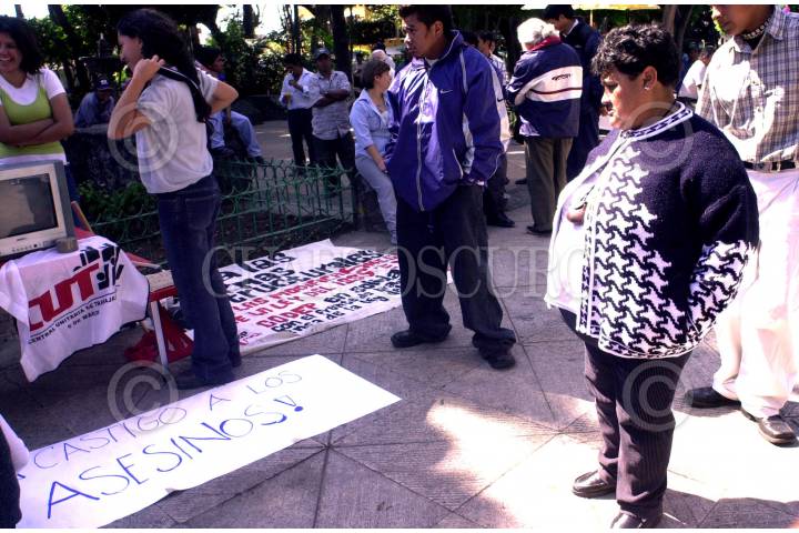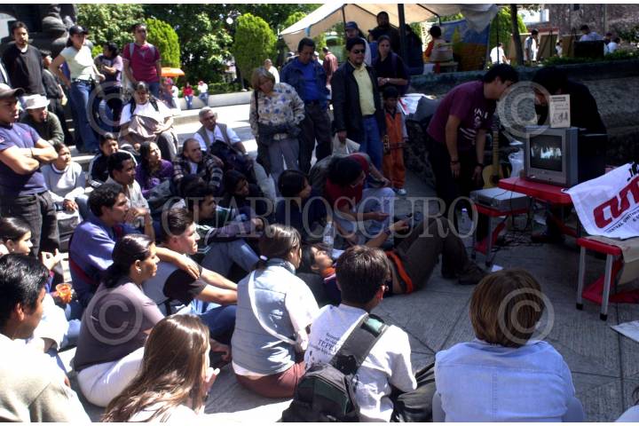 Cuernavaca, Morelos25ENE2004.- Integrantes de la Central Unitaria de Trabajadores de Morelos y estudiantes se reunieron en la plaza cibica del centro de Morelos para realizar un mitin en apoyo a los pobladores de Tlalnepantla Morelos como también ver un video de los acontecimientos que ocurrieron en el municipio. FOTO: Eunice Adorno/CUARTOSCURO.COM