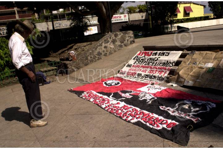 Cuernavaca, Morelos25ENE2004.- Integrantes de la Central Unitaria de Trabajadores de Morelos y estudiantes colocaron en la plaza civica pancartas de apoyo a los pobladores de Tlalnepantla. FOTO: Eunice Adorno/CUARTOSCURO.COM