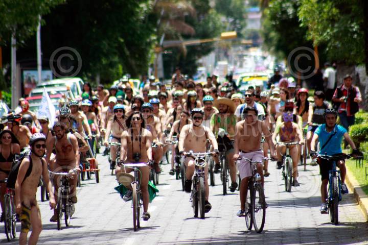 PUEBLA, PUEBLA, 20JUNIO2015.- Un centenar de ciclistas participaron en el World Naked Bike Ride, que recorrió las principales vialidades de la capital poblana, para pedir respeto para las personas que usan la bicicleta como medio de transporte. FOTO: HILDA RÍOS / CUARTOSCURO.COM
