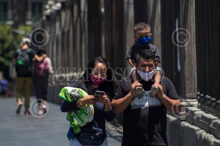 En medio de medidas sanitarias de la "nueva normalidad", como lo es el uso de cubrebocas, una familia camina frente a la catedral de la Ciudad de México