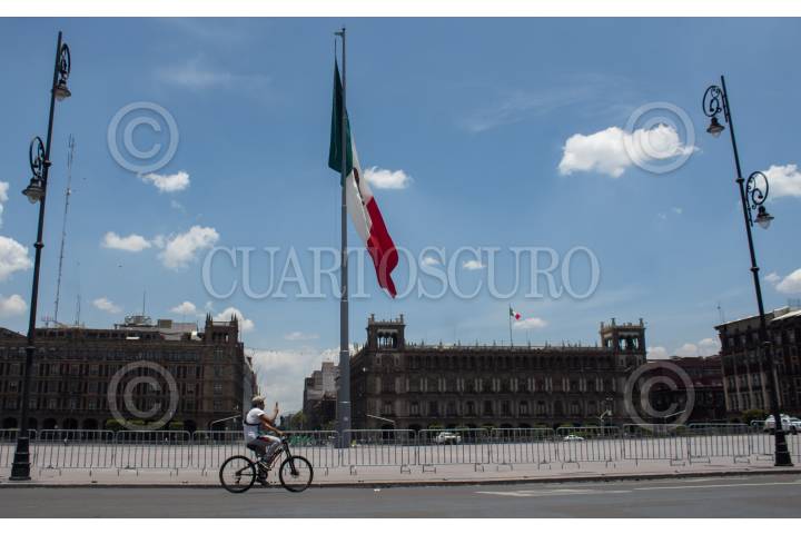 Ante la "nueva normalidad" y aún en semáforo rojo, un joven montado en su bicicleta toma una fotografía del Zócalo de la Ciudad de México