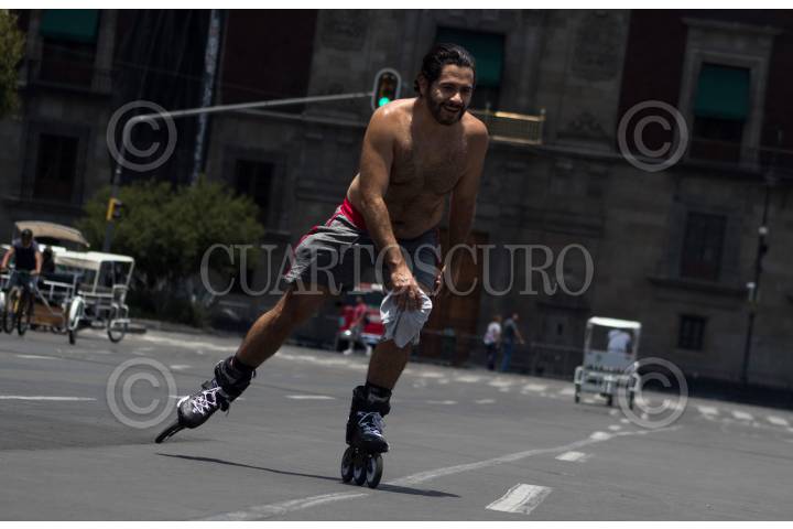 Un joven aprovecha la poca movilidad de autos y personas en el Zócalo de la Ciudad, esto debido a la emergencia sanitaria por COVID-19, para deslizarse en patines frente a la Catedral