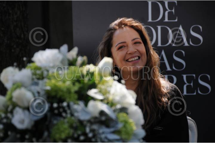 Lucía Méndez posa para las cámaras al término de su conferencia.