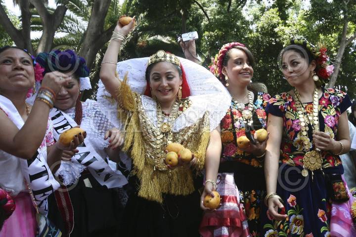 PUEBLA, PUEBLA., 08MAYO2011.- La comunidad de oaxaqueños en Puebla pertenecientes al club Salinacrucense 12 de mayo, celebraron el inicio de sus fiestas tradicionales a un costado del zócalo de la ciudad, con el baile y la tirada de frutas y mezcal que es parte de su tradición. FOTO: FRANCISCO GUASCO/CUARTOSCURO.COM