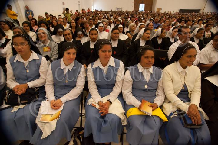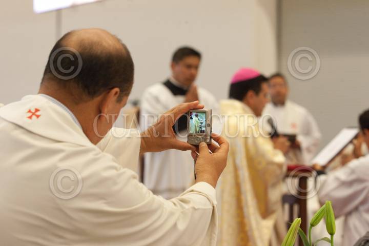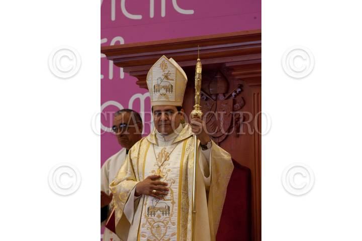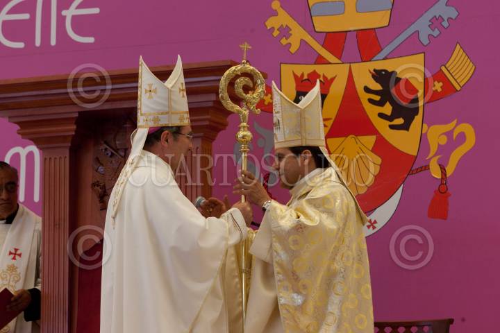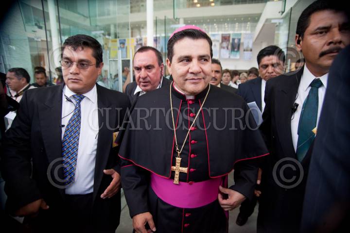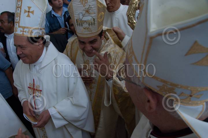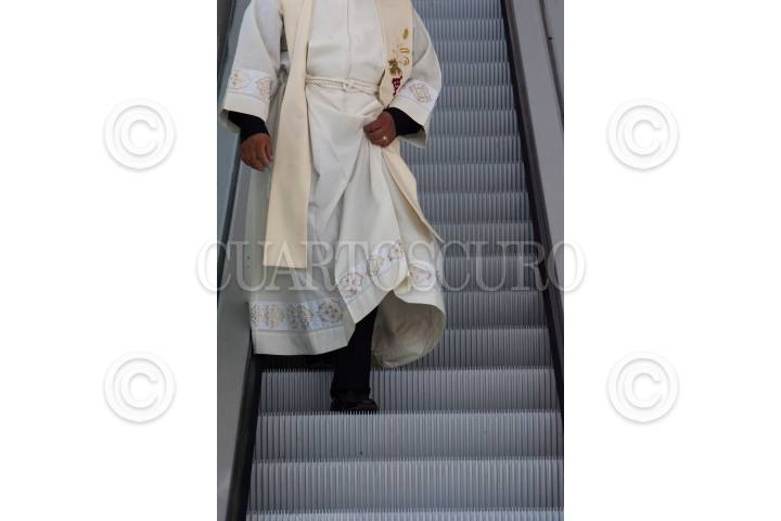 QUERÉTARO, QUERÉTARO, 16JUNIO2011.- Faustino Armendáriz, Obispo de Tamaulipas, toma posesión de la Diócesis de Querétaro. A su arribo, con una hora y media de retraso, le reciben en el hangar de gobierno del estado, el obispo saliente Mario de Gasperín, el Secretario de Gobierno y el presidente municipal del municipio de El Marqués y Christopher Pierre, nuncio apostólico. La celebración eclesiástica de la toma de posesión de la diócesis llevada acabo en el Querétaro Centro de Convenciones, donde asistieron más de 12 mil fieles; y 52 obispos de la república. Al termino de la misa el nuevo obispo se reunió con periodistas que cubrían el evento a quienes les brindó la bendición. FOTO: DEMIAN CHAVEZ/CUARTOSCURO.COM