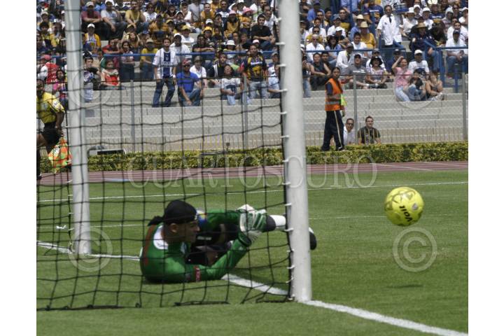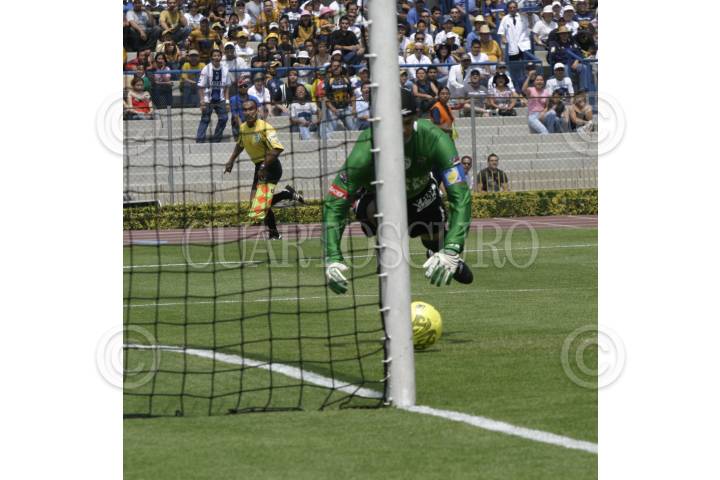 MEXICO,DF,04.MAYO,2008.- Miguel Calero, portero del Pachucha, se vio obligado a lanzarse para evitar que el balón, que le regreso un compañero, entrara a su porteria durante los primeros minutos del partido con los Pumas de la UNAM, que termino empatado cero a cero. FOTO: PEDRO VALTIERRA/CUARTOSCURO.COM