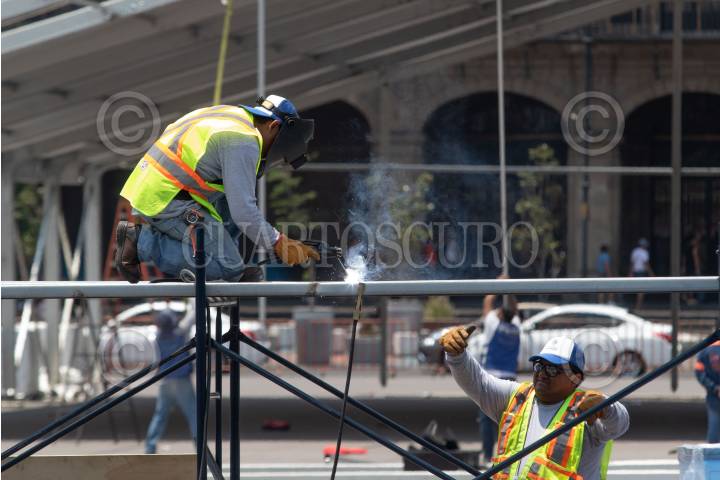 Trabajadores soldán un escenario que esta siendo colocado en el zócalo.