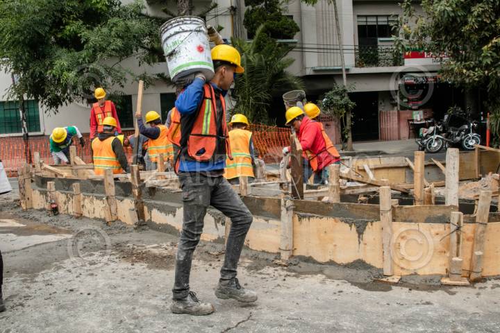CIUDAD DE MÉXICO, 01FEBRERO2024.- Un joven obrero carga una cubeta de cemento durante la restauración de banquetas en la calle de Tamaulipas en la colonia Condesa. FOTO: MOISÉS PABLO/CUARTOSCURO.COM