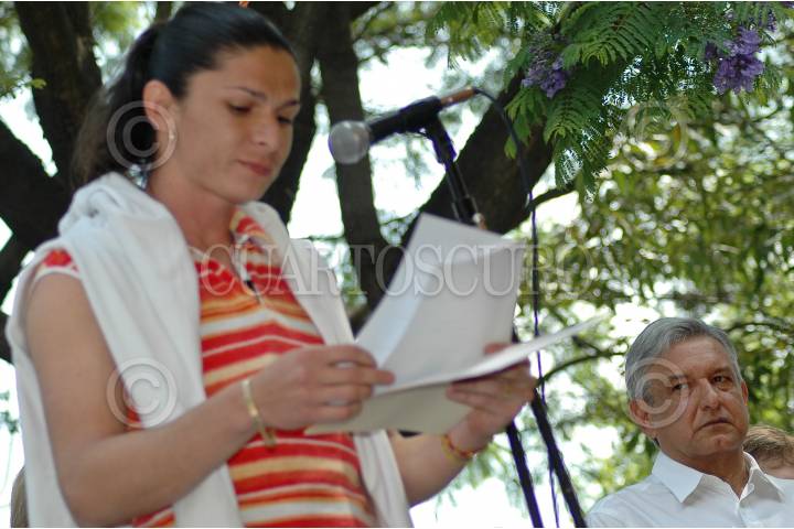 MÉXICO, D.F., 24MAYO2009.- Andres Manuel López Obrador, ex candidato presidencial observa a Ana Gabriela Guevara candidata del PRD a jefa delegacional durante durante un evento con candidatos a jefe delegacional y diputados federales y locales que se realizo en el parque Cañitas sobre la avenida México - Tacuba. FOTO: RODOLFO ANGULO/CUARTOSCURO.COM