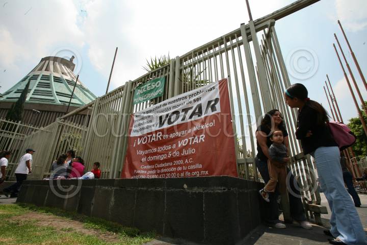 MÉXICO, D.F., 28JUNIO2009.- A las afueres de la Basílica de Guadalupe, se observa una manta lla mando a votar en las elecciones del próximo 5 de julio. FOTO: RICARDO CASTELAN/CUARTOSCURO.COM