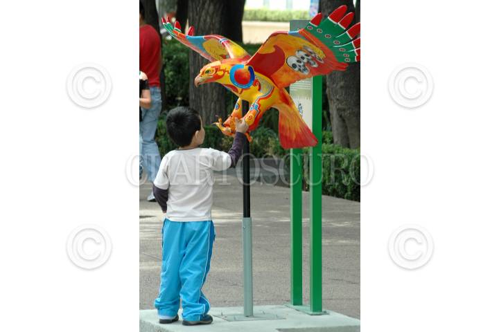 MÉXICO D.F., 12JULIO2009.- Un niño observa una escultura de un Aguila como parte de la exposición "Animal Celebration" que se exhibe sobre el Paseo de la Reforma, en la que se exponen animales en peligro de extinción como rinocerontes, águilas reales y quetzales. FOTO: RODOLFO ANGULO/CUARTOSCURO.COM
