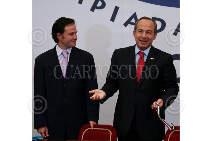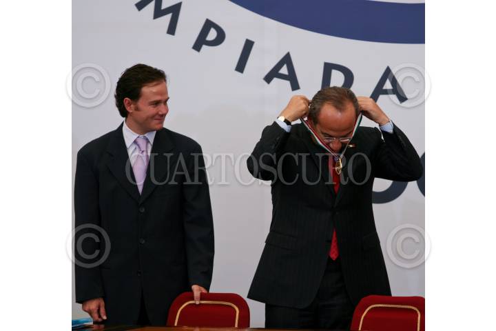 MÉXICO, D.F., 05AGOSTO2009.- Berrnardo de la Garza, director de la CONADE observa como el presidente Felipe Calderón se coloca una medalla que le fue obsequiada durante la ceremonia de premiación de la Olimpiada Nacional y Paralimpiada 2009 que se realizo en el patio central de Palacio Nacional. FOTO: RODOLFO ANGULO/CUARTOSCURO.COM