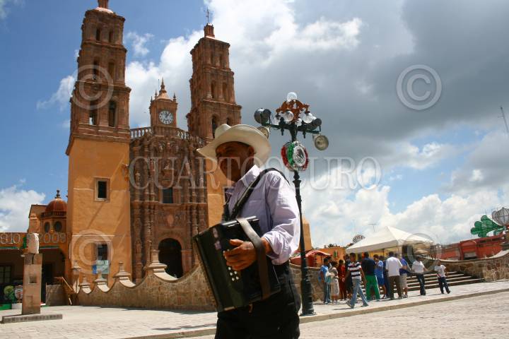 DOLORES, HIDALGO GUANAJUATO 12SEPTIEMBRE2009.- Un musico camina por las calles del municipio a espaldas se observa la catedral de Dolores. FOTO: SÁSHENKA GUTIERREZ/CUARTOSCURO.COM